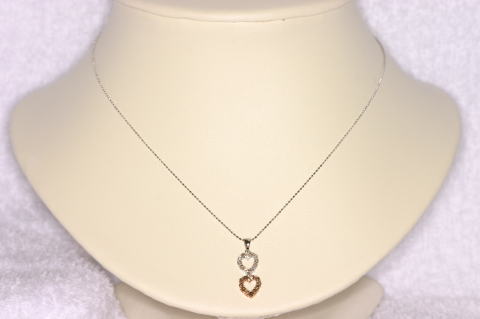 輝きの良いダイヤモンドをハート型に並べて上下につないだペンダントです。上はホワイトゴールド、下は18金と枠の色を変えてあります。おしゃれなアイテムです。 |