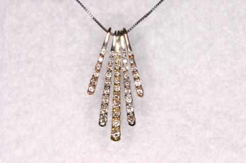 枠材料に3色の金(K18/K18WG/K18PG)を用いたカラフルなバータイプのペンダントです。動きにあわせてダイヤモンドがキラキラ輝き、光のハーモニーを楽しんでください。 |